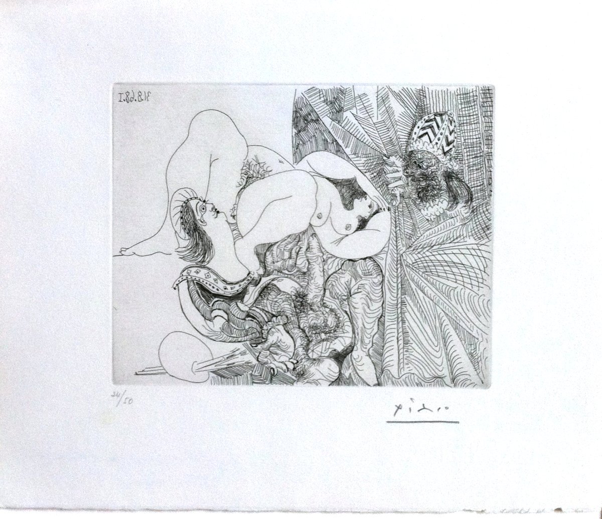 Raphael et la Fornarina III et le pape en voyeur cache, 1968, eau forte