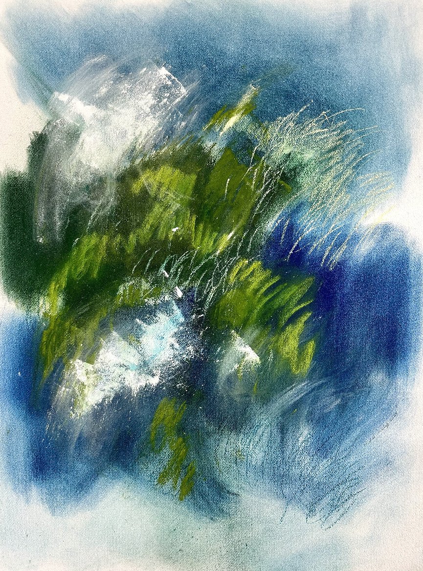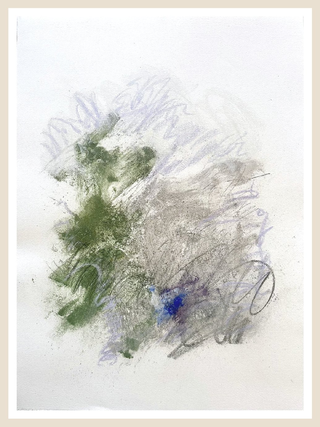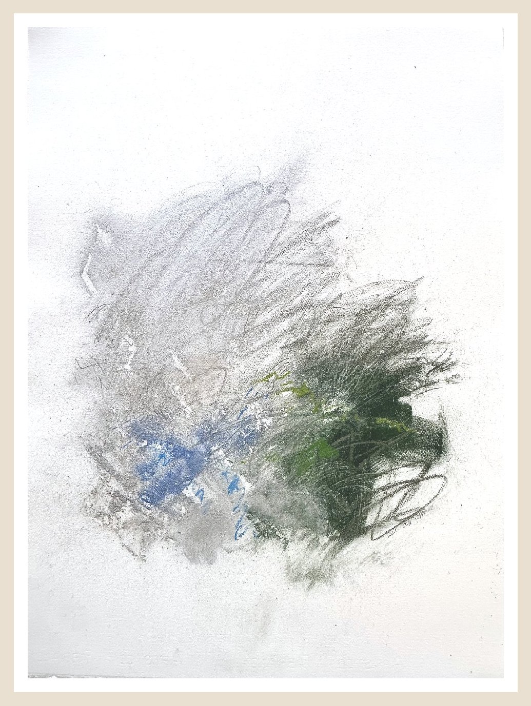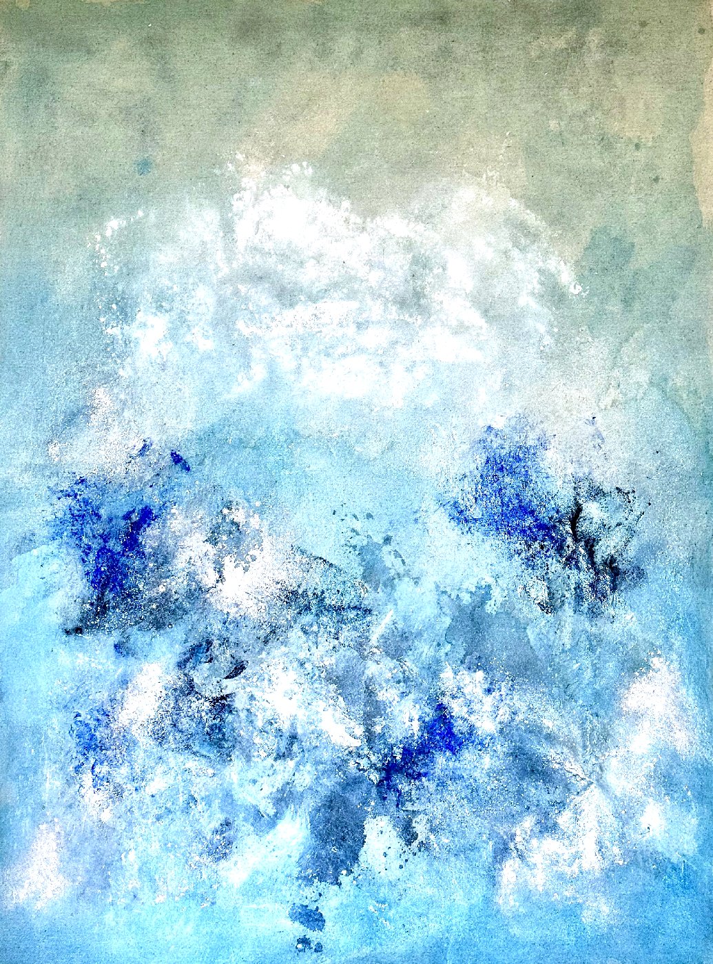 En montre ci-haut: Bords de mon lac #10, 2024, techniques mixtes sur papier Arches, 76 x 56 cm
