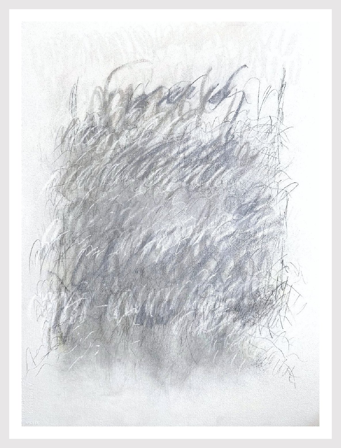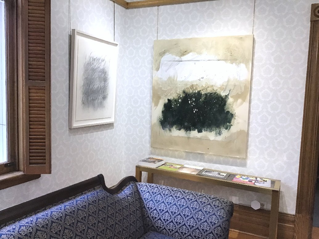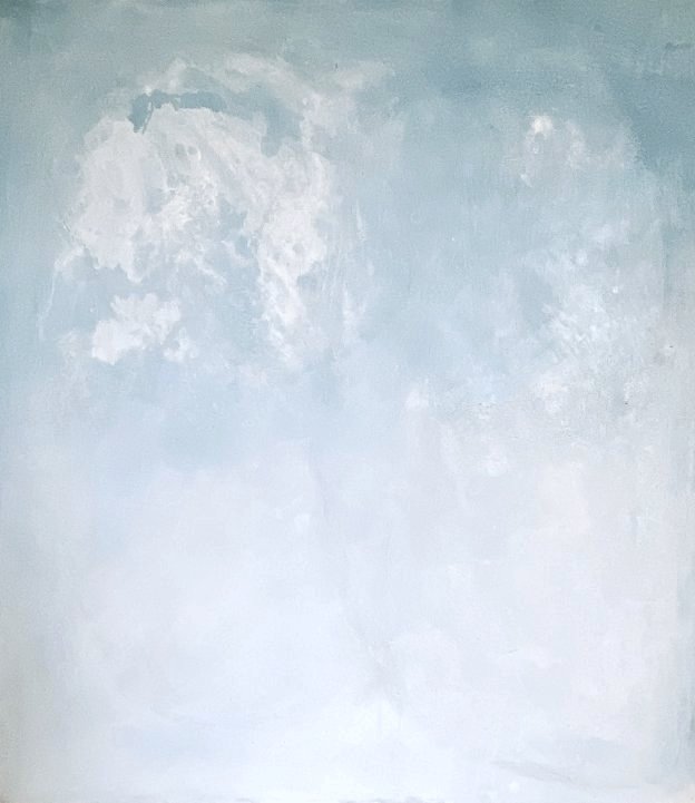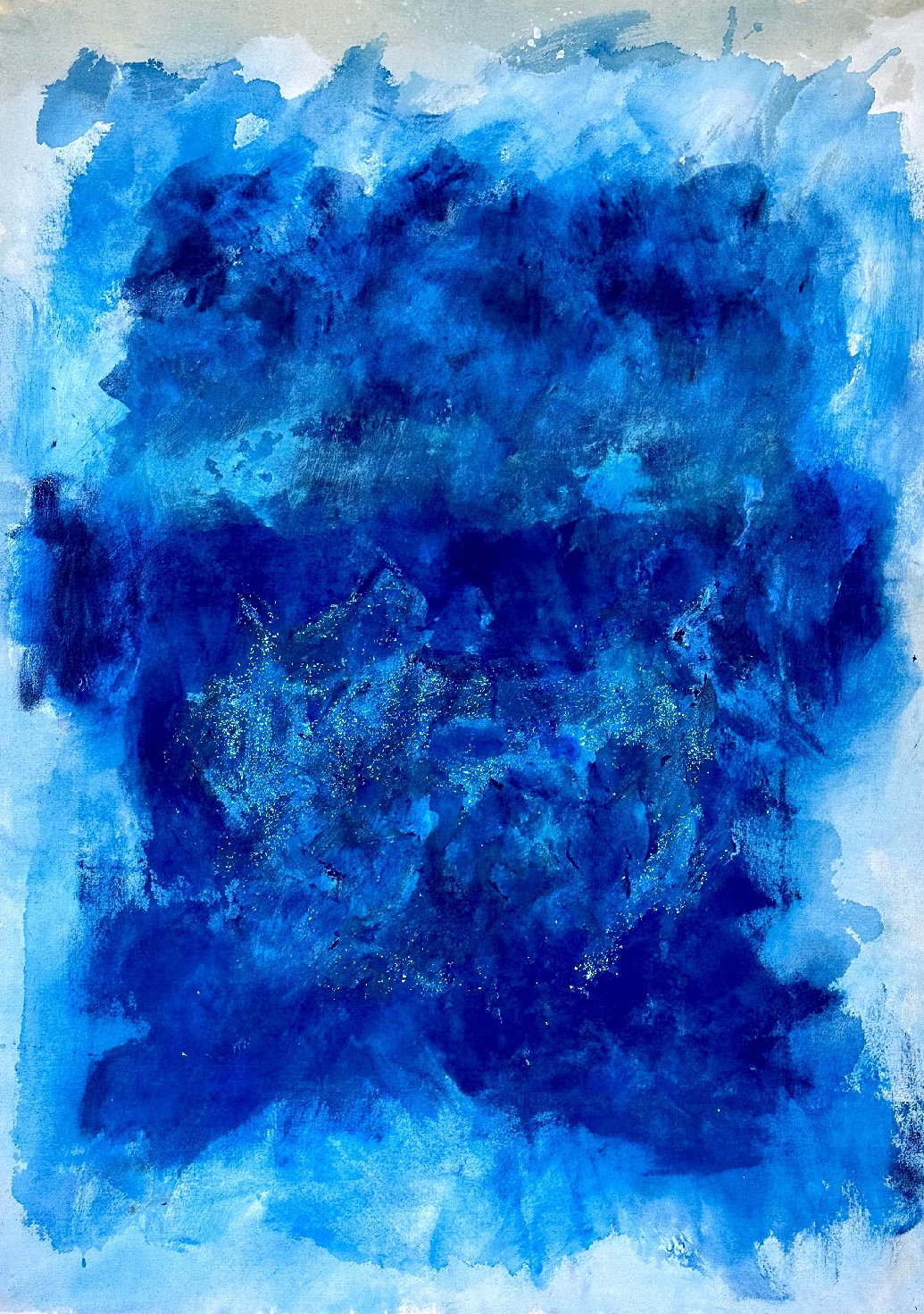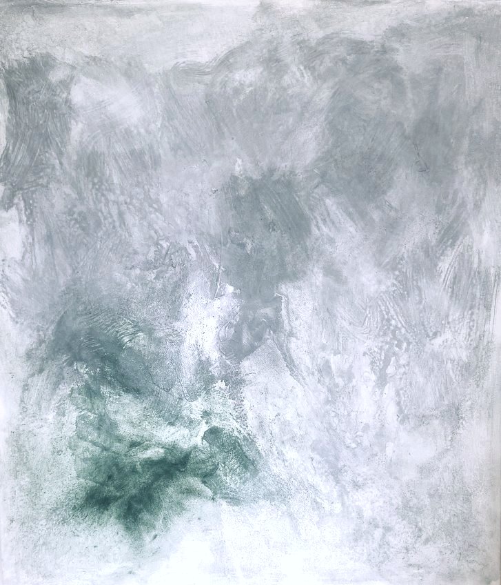 En montre ci-haut: Bords de mon lac #10, 2024, techniques mixtes sur papier Arches, 76 x 56 cm