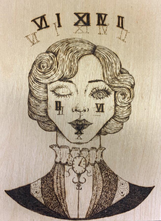 Danis, Katharine J. Chronos, pyrogravure sur bois, 15,2 x 20,3 cm