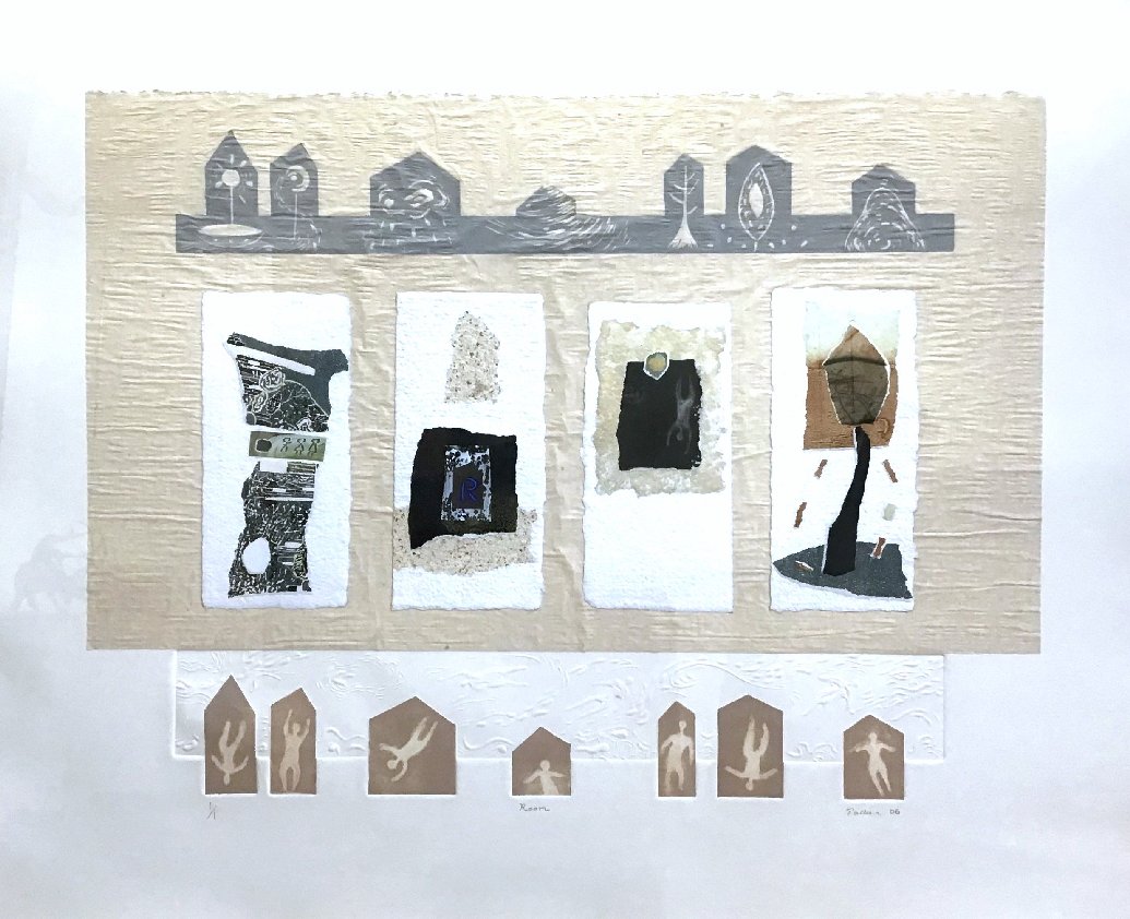 Techniques mixtes: collage, collagraphie au carborundum, linogravure et gaufrure