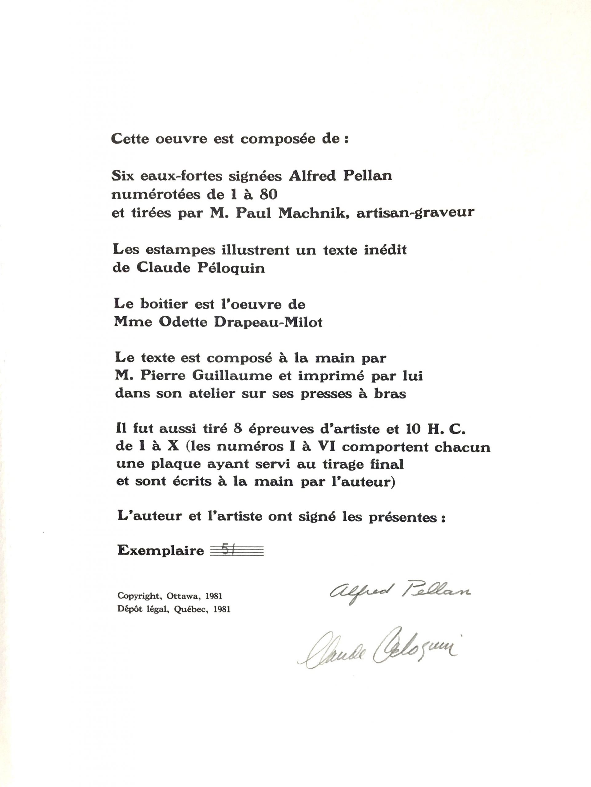Publié en 1981, l’Album édité à 80 exemplaires contient six eaux-fortes signées au crayon par l’artiste Alfred Pellan, numérotées 51/80 et accompagnées d’un texte de Claude Péloquin.