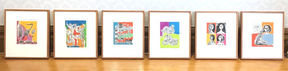 Les six estampes sont encadrées sous verre dans des cadres double face, montrant l’eau-forte signée au recto et le texte correspondant au verso.
